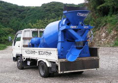 車載用の生コンミキサーです。動力ユニットを装備しているので、配管、配線の工事は一切必要ありません。